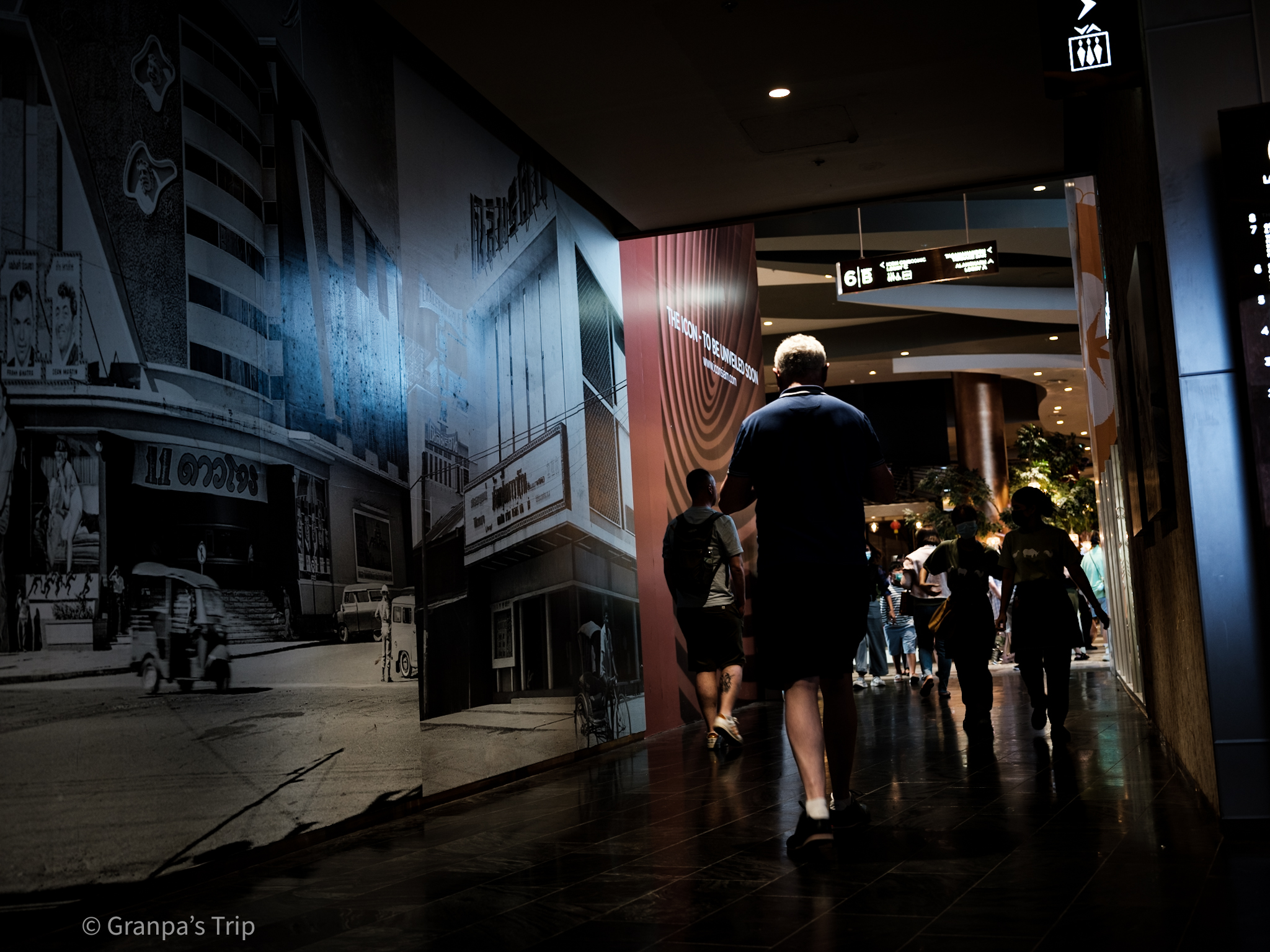 エレベータ乗り場の前の通路、バンコクのレトロな写真のプリントと、現在の人々との対比。