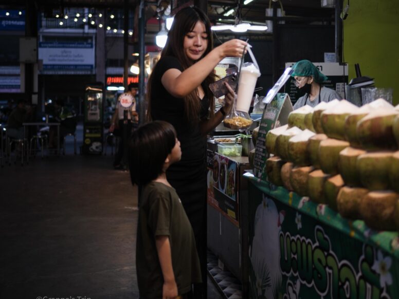 ナイトバザールの片隅で、美人ママと晩メシを待つ息子。男やったら分かるやろ、あの頃オカンの隣に立っとった自分の姿を。ワシのオカンはぽっちゃりやったけどな、胸張って「これがウチの母ちゃんや」言えたもんや。