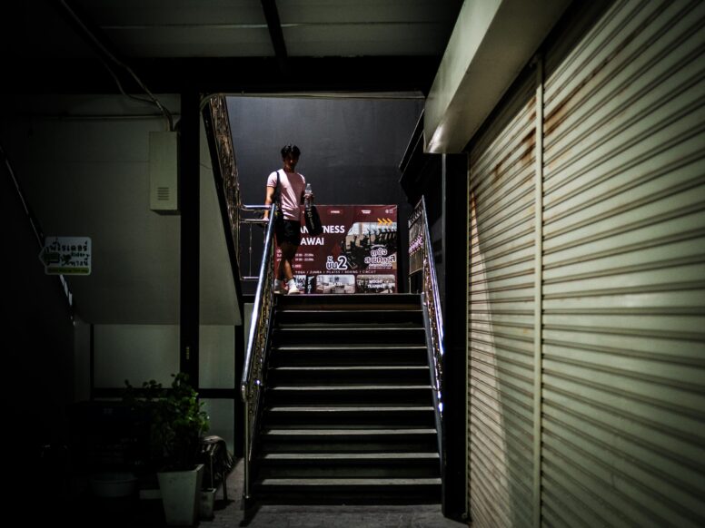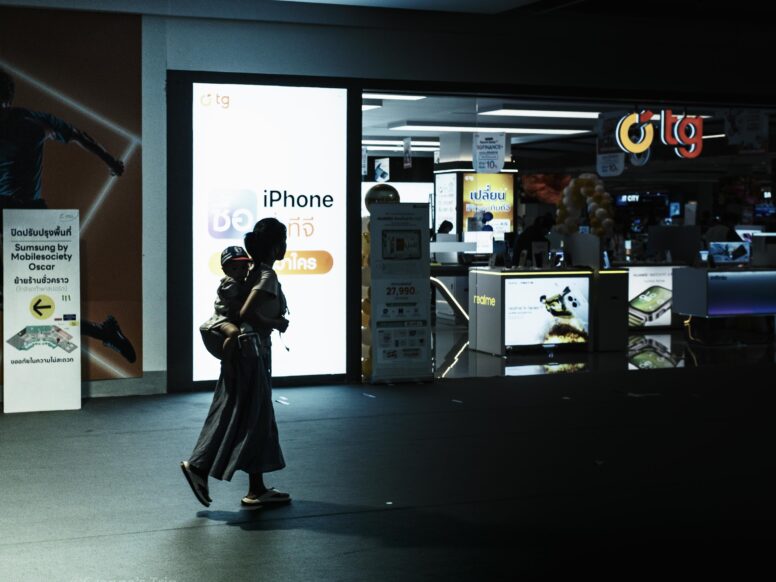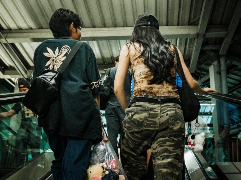 エスカレーターは今日の思い出を運ぶ坂道や。袋の中も、心の中も、ぎょーさん詰まっとるわ。