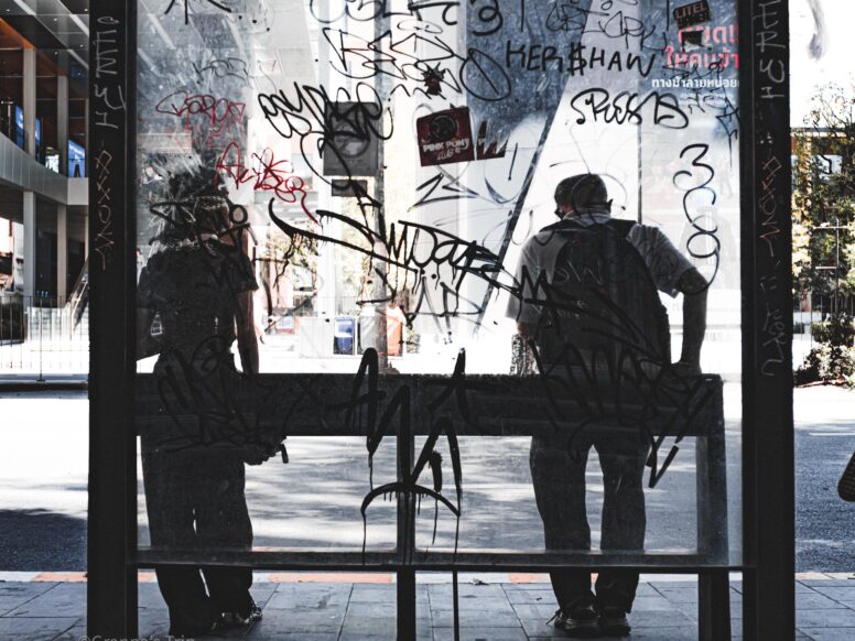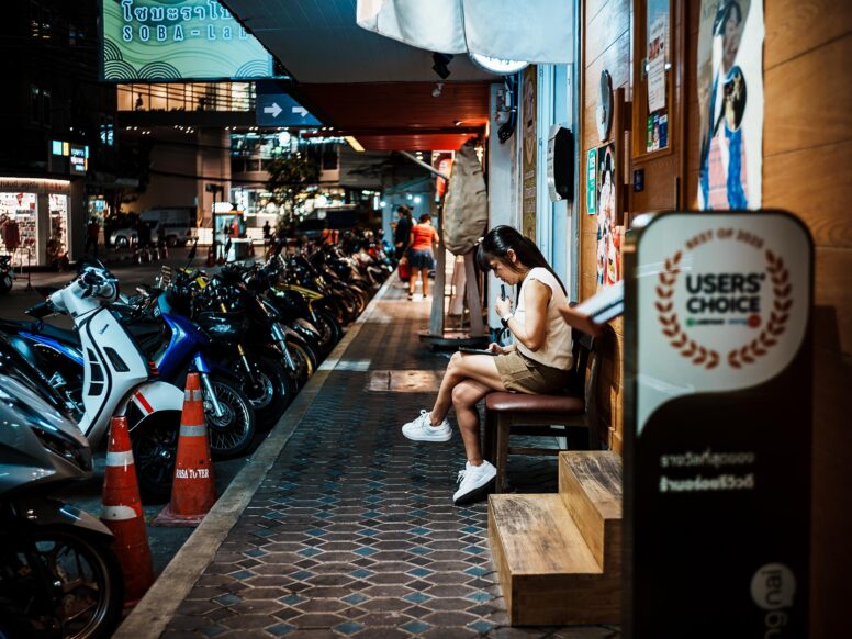 日陰ん中スーッと入った瞬間、ちょっと涼しゅうてホッとしたわ。チャイナタウンのこの道、朝からバイクも車もようけ走ってるけど、ワシはこのチャリがいっちゃん落ち着くんや。昔から変わらんペースで、のんびり行こか思てな。そこのバイクの兄ちゃん、急いでも昼メシには早いで。